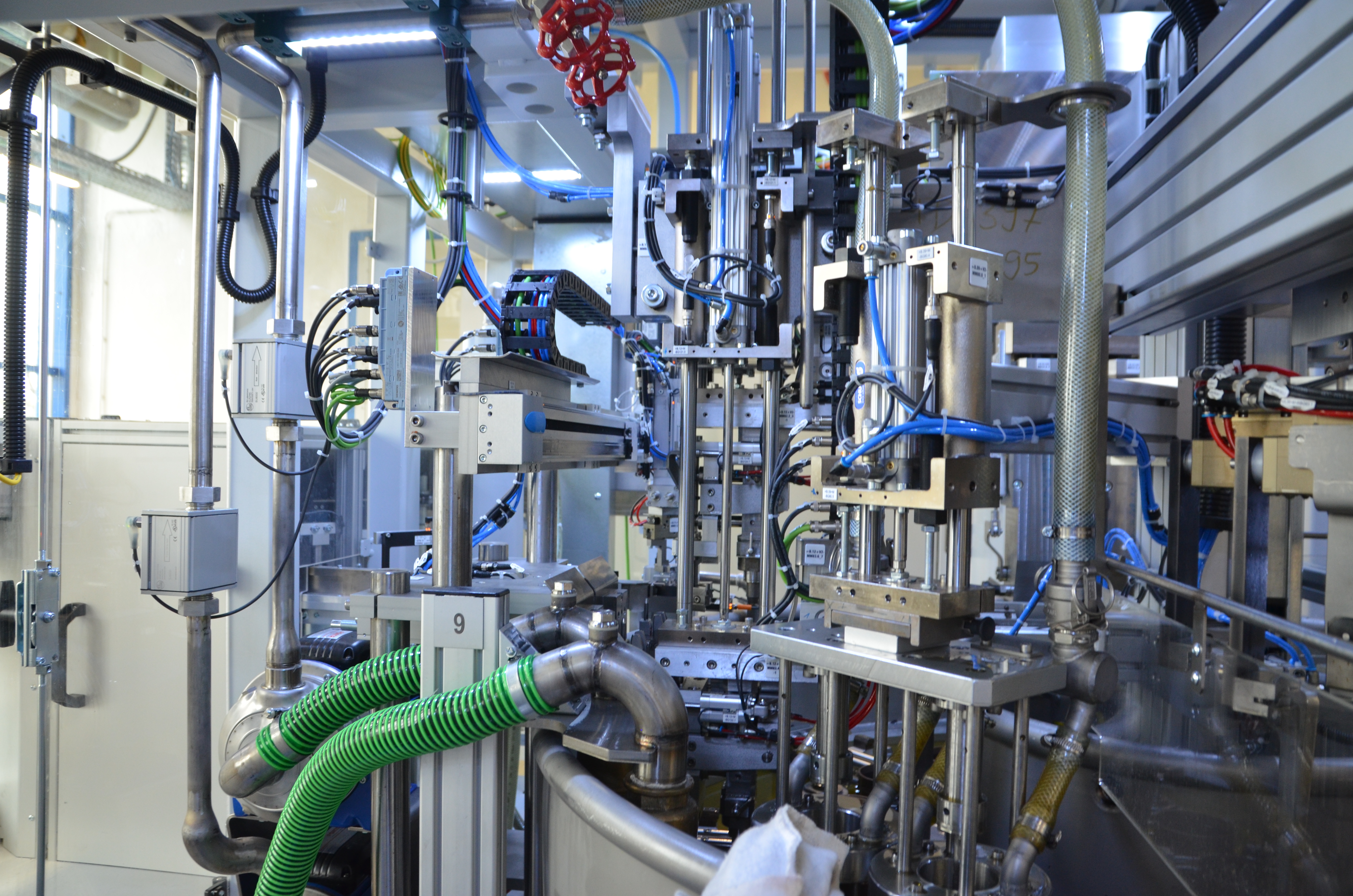 The material flow is handled by handling systems, rotary tables in the wet and dry areas and indexing conveyors.